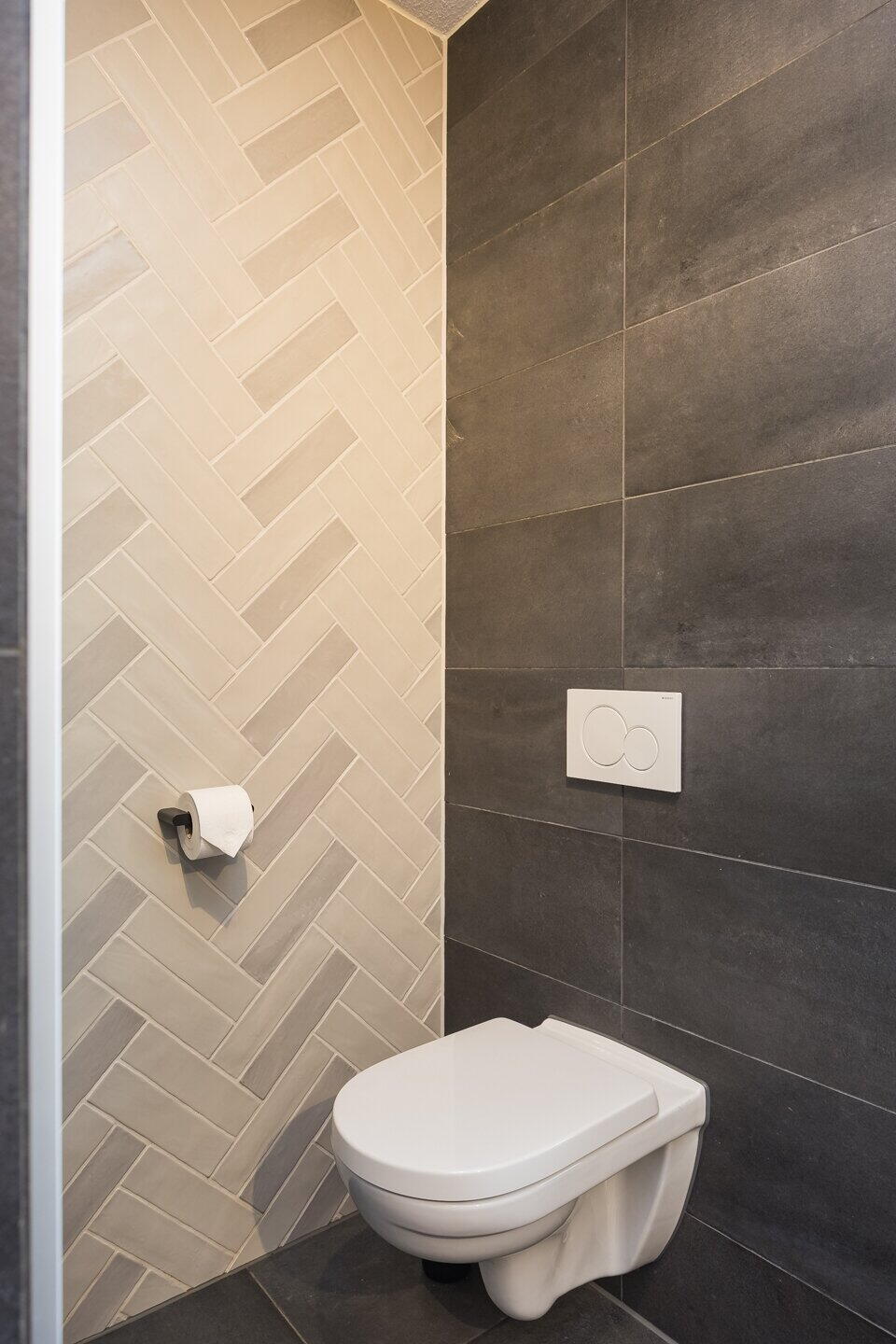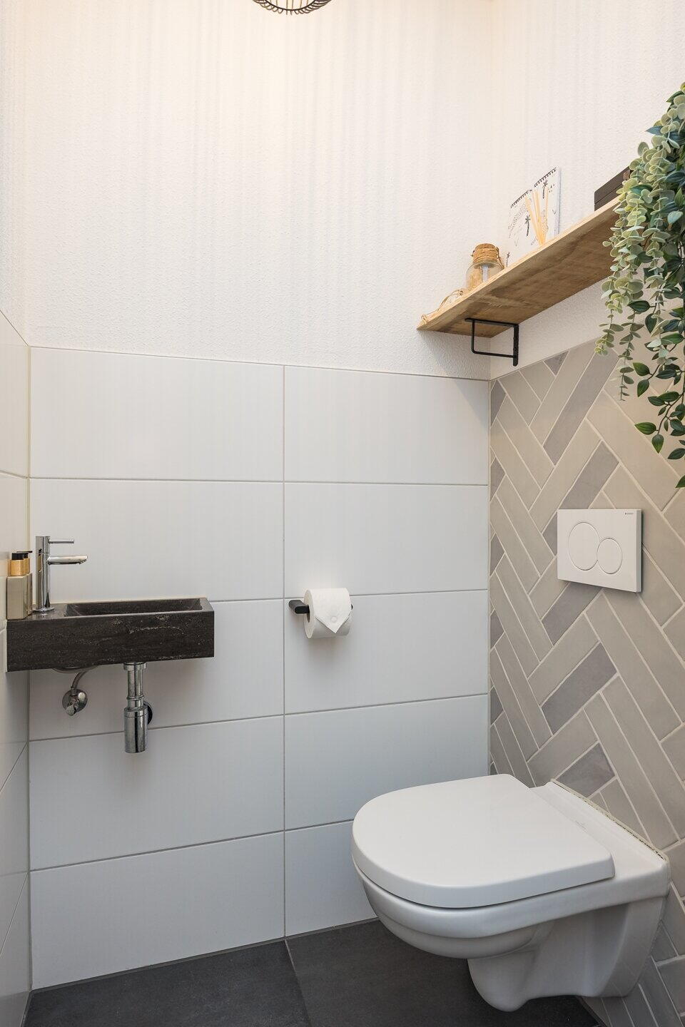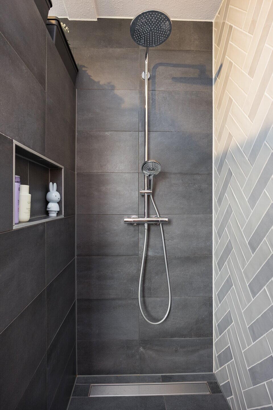 De badkamer is modern uitgevoerd en voorzien van een inloopdouche, toilet en een wastafelmeubel met wastafel. De ruimte is praktisch ingericht en netjes afgewerkt.
