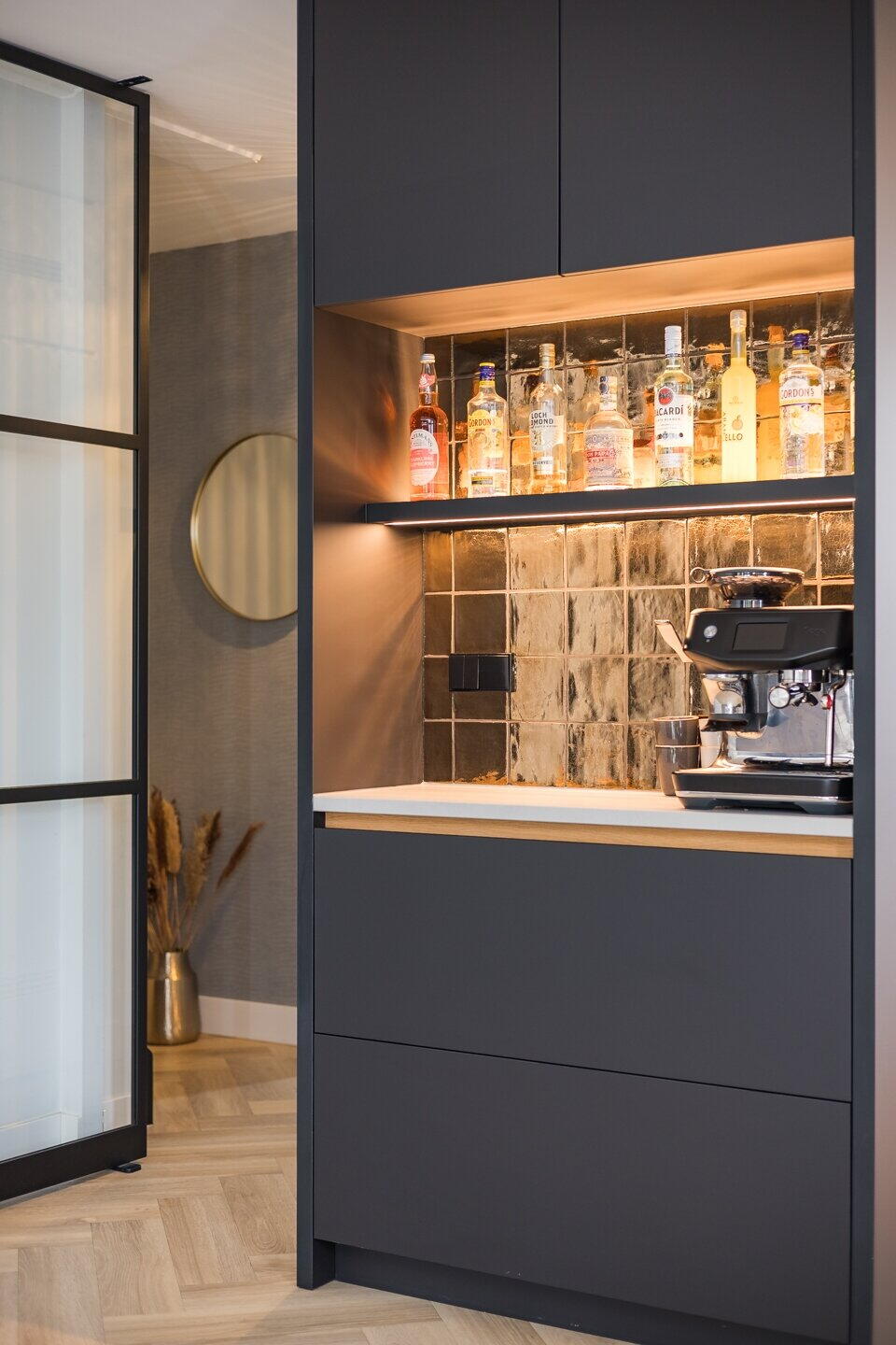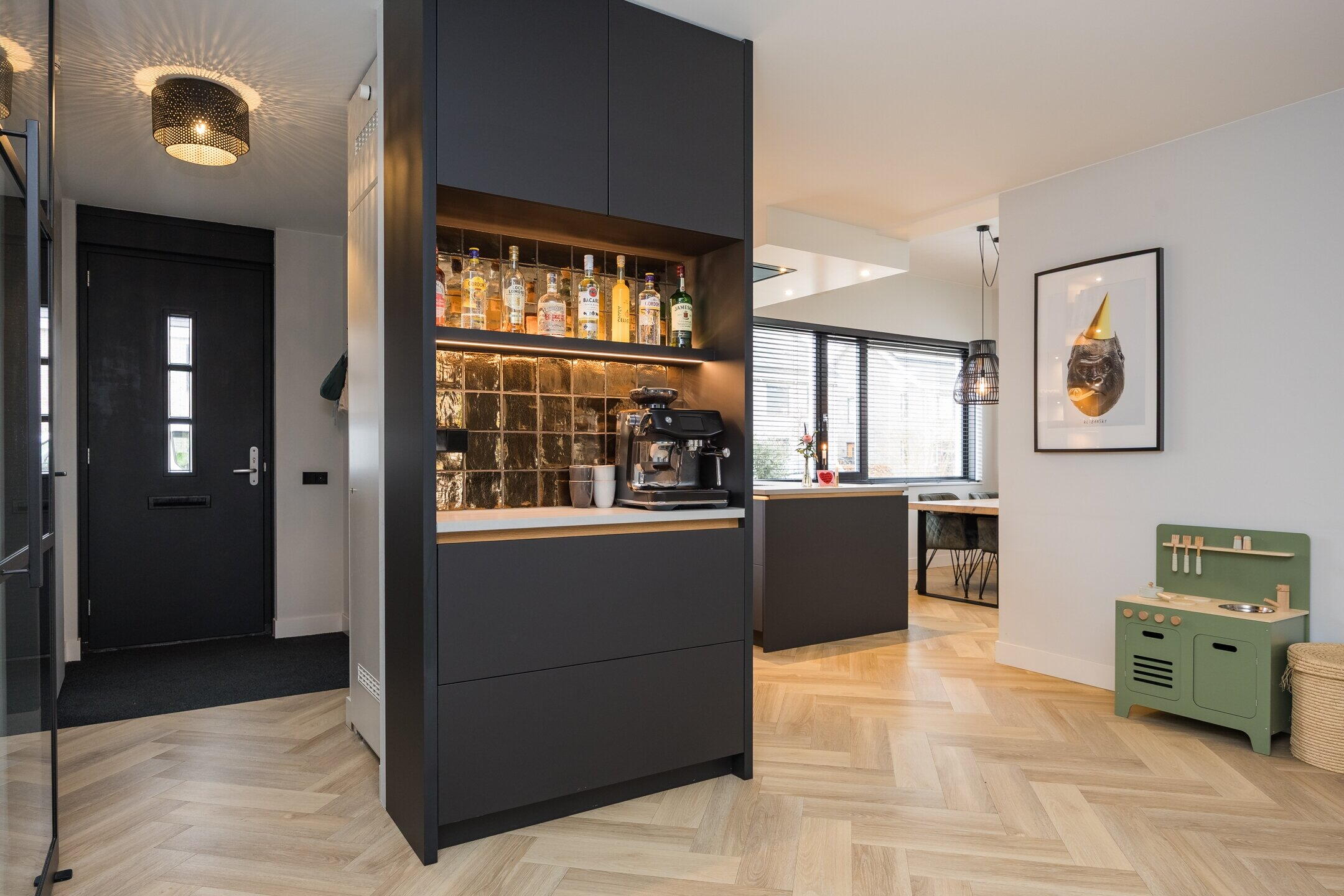 De uitgebouwde woonkeuken aan de voorzijde vormt het hart van de woning. Deze moderne keuken is geplaatst bij de bouw van de woning en is ruim opgezet met een centraal kookeiland, waardoor koken, leven en samenzijn hier op natuurlijke wijze samenkomen. De keuken is voorzien van diverse hoogwaardige inbouwapparatuur, waaronder een wijnklimaatkast, vaatwasser, Quooker, oven, inductiekookplaat en een koel-/vriescombinatie. Daarnaast is er een stijlvolle koffiecorner gerealiseerd en beschikt de keuken over volop werk- en bergruimte. Dit is een plek waar functionaliteit en luxe perfect samenkomen.
