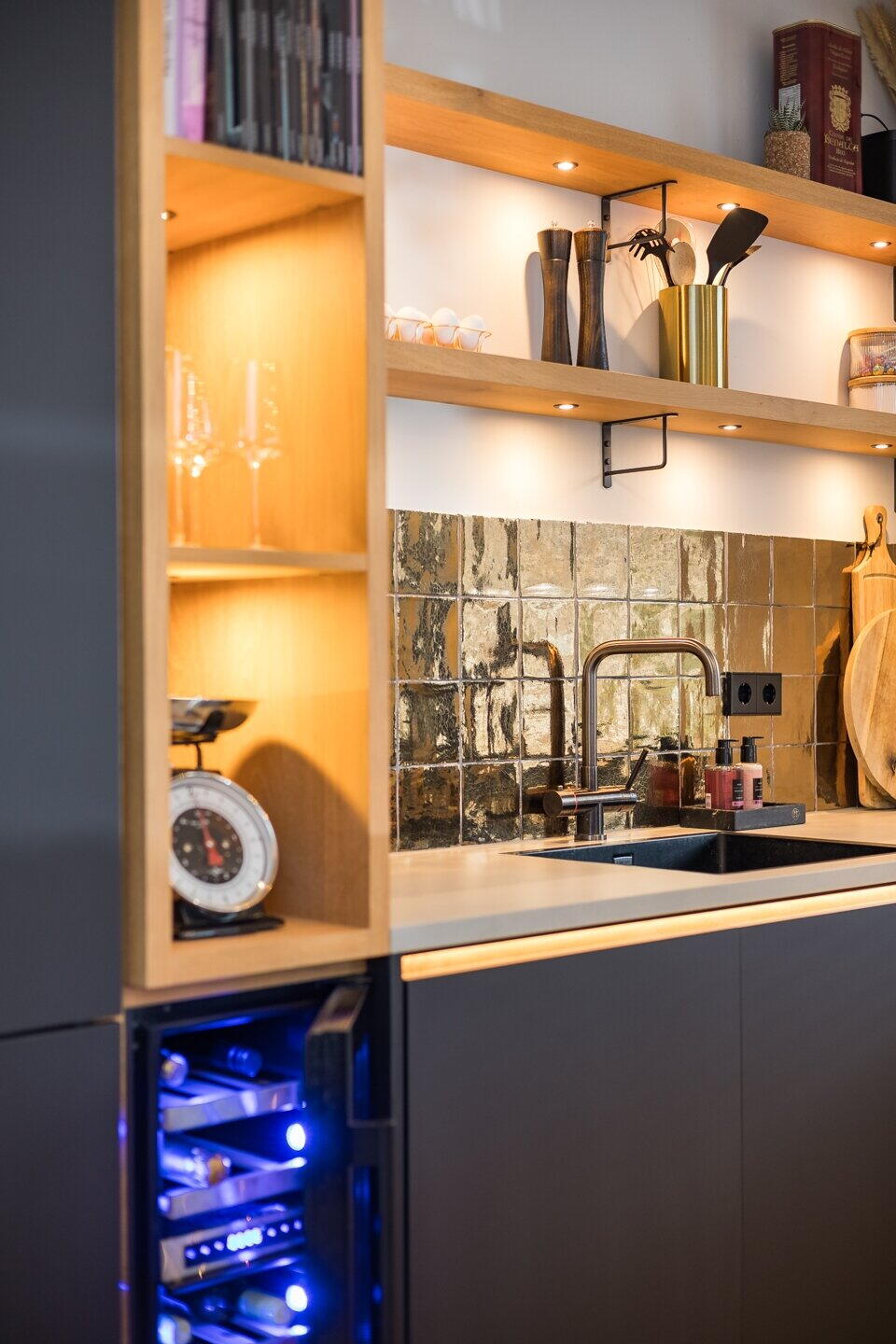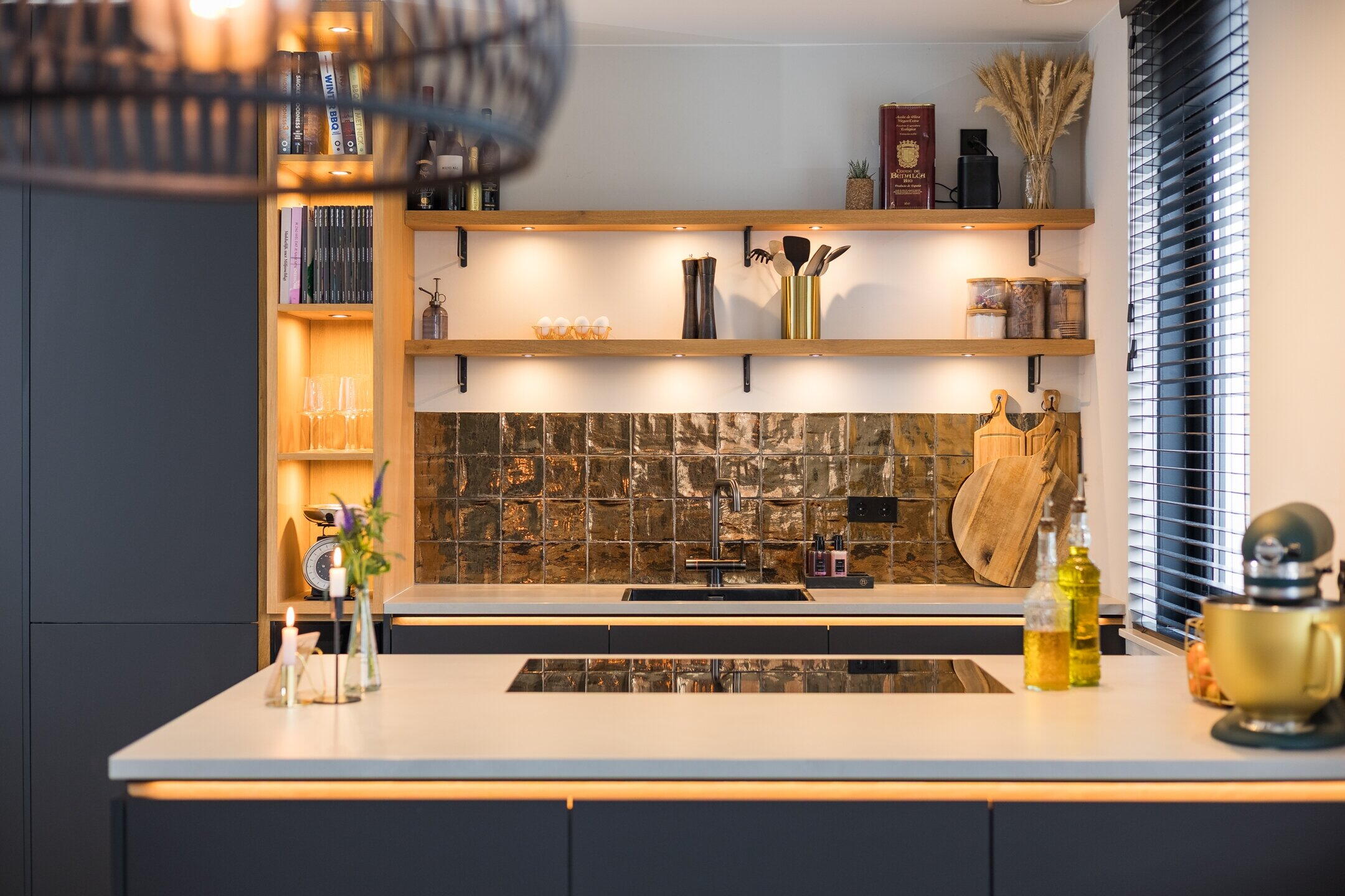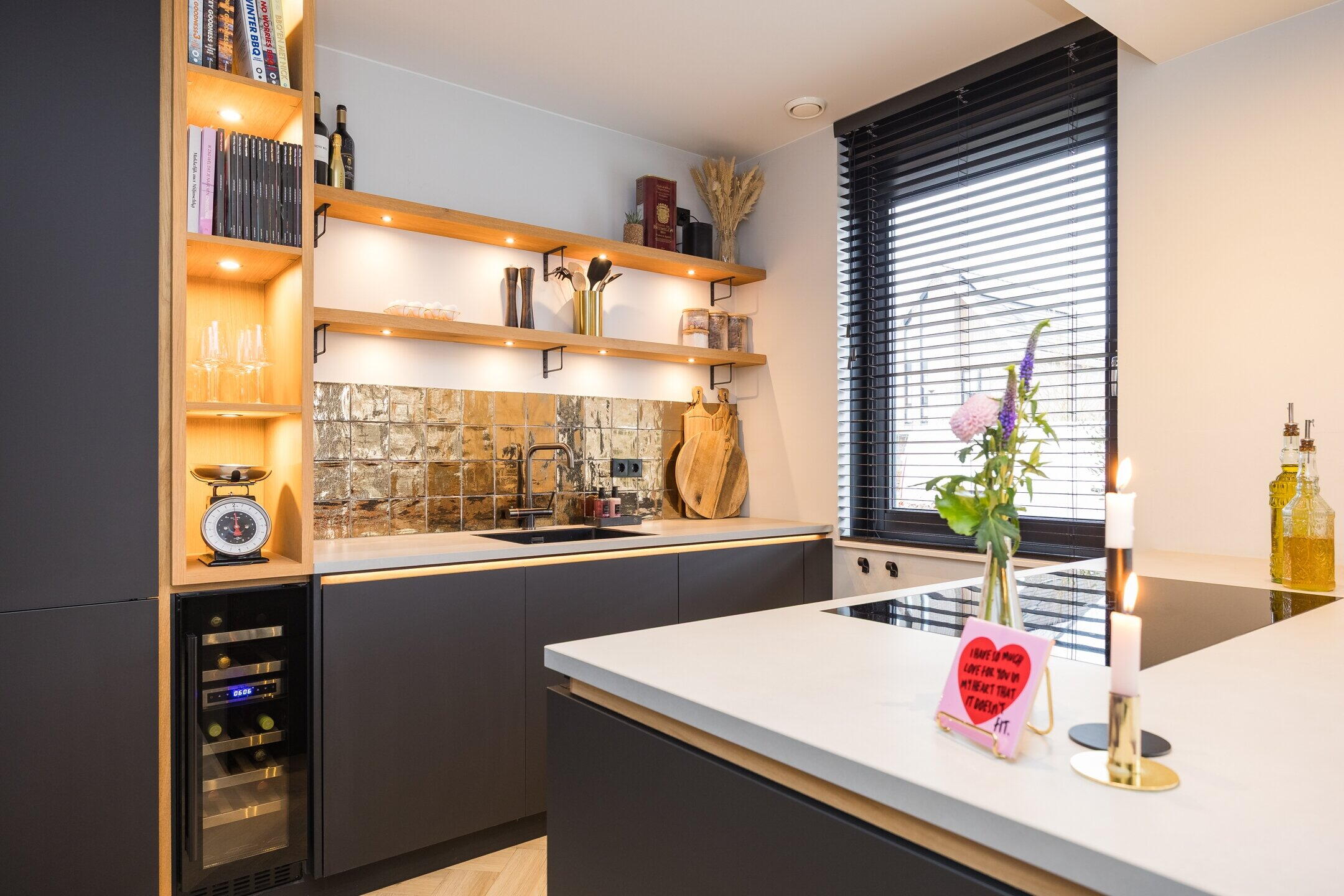 - Luxe keuken met kookeiland voorzien van wijnklimaatkast, Quooker en moderne inbouwapparatuur