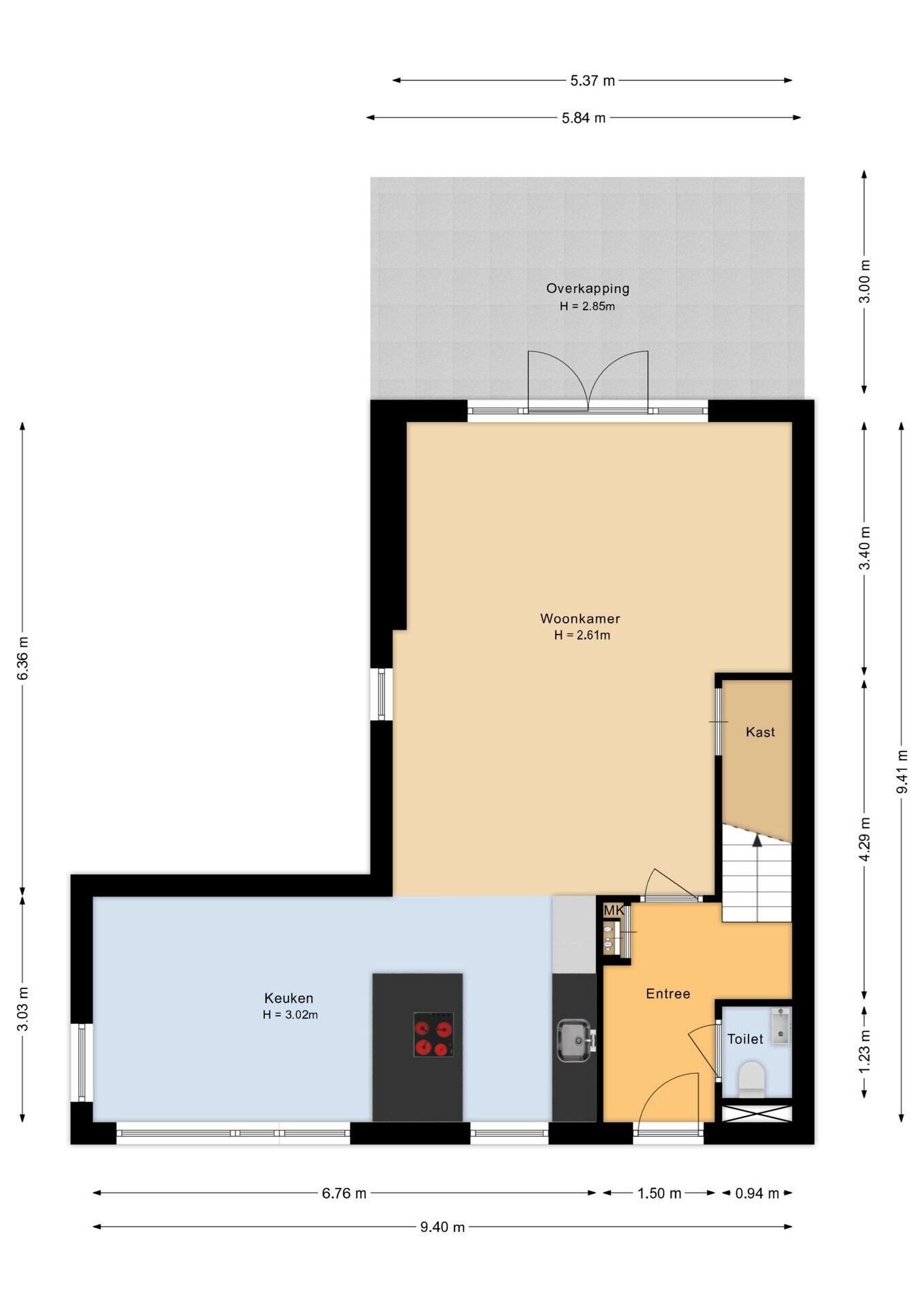 Via de entree betreedt u de hal met meterkast, toilet en trapopgang. Vanuit hier loopt u via een stalen deur door naar de leefruimte, waar direct de hoogwaardige afwerking en prettige sfeer opvallen. Onder de trap bevindt zich een praktische trapkast voor extra bergruimte.